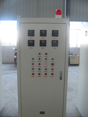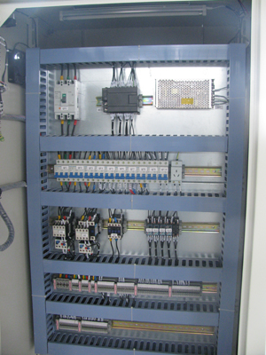 有高等級防護標準的工業控制柜。PLC控制柜為前后開門,前門為單開門,為雙開門。在前門板上安裝了電壓表、電流表、平板電腦和控制按鈕及指示燈。在柜體中央有前后兩塊鍍鋅安裝板,前安裝板上裝有PLC、信號隔離變送器、控制中間繼電器及控制信號輸入輸出端子。后安裝板上裝有電氣控制回路使用的斷路器、交流接觸器、熱繼電器和電氣輸出端子。